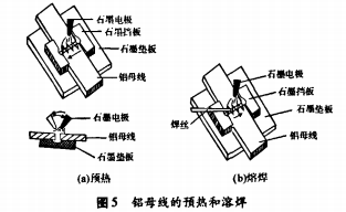 (8)焊工施焊時,焊工頭戴面罩,一手拿焊絲一手拿石墨碳棒,不斷地將已經(jīng)生成的氧化鋁清出熔池。