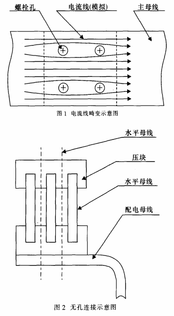 目前,低壓成套開關設備母線槽系統(tǒng)的連接主要是利用螺栓連接。螺栓連接在小電流、母線槽數(shù)量不多的情況下具有緊湊、可靠、方便等特點;而隨著用電設備的增加,開關柜的容量越來越大,用螺栓連接的缺點也日益顯露出來:由于需要在母線槽上鉆螺栓孔,造成母線槽截面不同,必然引起母線槽電流流線的畸變,如圖1所示。所以要求螺栓用孔盡可能的小以盡量減小對電流的影響,但是在配電房里進行拼柜的過程中不可避免的存在累積公差,開關柜的數(shù)量越多累積公差越大,往往造成配電母線槽和主母線槽的螺栓孔產(chǎn)生錯位。為了解決螺栓孔錯位問題,多數(shù)情況下是采取沖橢圓形孔或沖大孔。這就存在矛盾:螺栓孔開大了,嚴重影響母排載流量,螺栓孔開小了,安裝不方便。研究新的連接方法成了開關柜制造商的關注的焦點,無孔連接這種新技術逐漸成為設計人員研究的對象,并且取得一定的成功。目前已有多家廠家研究出形式各異的的無孔連接技術。筆者也于2001年開始對無孔連接技術進行研究,并設計出另一種與眾不同的無孔連接方式,經(jīng)過產(chǎn)品試制和試驗,證明這種連接方法是行之有效的。