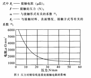 由公式(2)可知,影響母線槽搭接面接觸電阻的主要因素有表面的條件K、m和所施加的壓力F。當母線槽表面處理和接觸面積確定了,則Kj、m也確定了,于是接觸電阻Rj與壓力F成為反比關系,壓力F越大,接觸電阻Rj越小。圖5是壓力對兩片銅導體連接處接觸電阻的影響曲線圖。