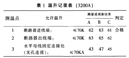 表2是本公司溫升試驗室的質檢人員按照國家標準GB7251.1-1997的有關條款對該樣柜進行溫升試驗,對整個母線槽系統(tǒng)的關鍵處和搭接面進行測量(測得部分溫升記錄)