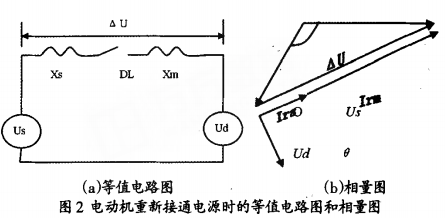 圖1所示為母線槽系統(tǒng)的某一段接線圖,圖2為電動機(jī)切換時的等值電路圖。圖中Us-電源電壓;Ud-母線槽上電動機(jī)的殘壓;Xs-電源等值電抗;Xm-母線槽上電動機(jī)組和低壓負(fù)載的等值電抗(折算到高壓母線槽壓);AU-電源電壓與殘壓之間的差拍電壓。