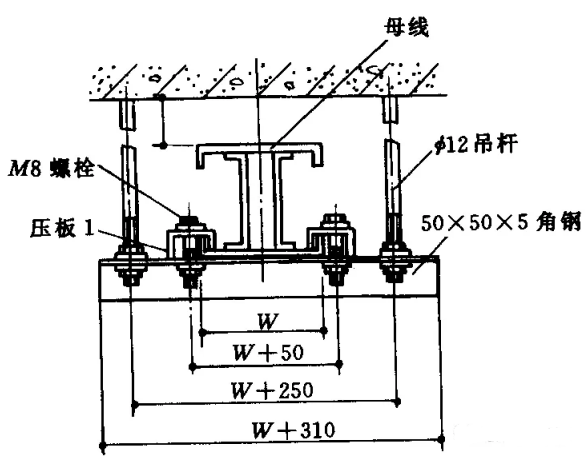 4.3母線槽懸掛吊裝。(圖4、圖5)吊桿直徑應與母線槽重量相適應,螺母應能調節。