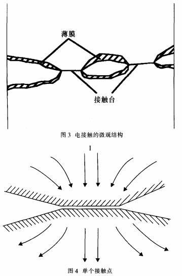 要知道在母線槽聯接處的電阻,除了母線槽自身存在的電阻外,還存在一個接觸電阻。這是因為:不管母線槽表面處理得怎樣光滑平坦,在微觀環境下,母線槽表面也是凹凸不平的,如圖3所示,兩片母線槽之間的搭接實踐上只要母線槽表面上許多小尖峰之間的接觸,電流流過搭接面的實踐面積減少了,電流線發生嚴峻的縮短現象,發生縮短電阻R,取其中一點剖析其結構如圖4所示。另一方面,母線槽從加工結束到裝在開關柜里有必定的時間差,很簡單因為暴露在空氣里而構成一層薄膜(如氧化膜等),使電阻增大,稱為膜電阻R,。所以接觸電阻實踐上是由這兩部分組成,即