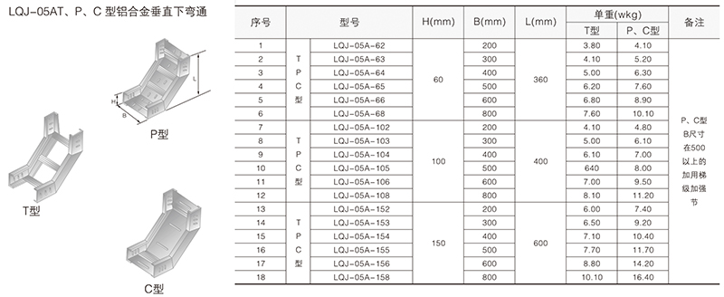 鋁合金電纜橋架在某種結構形式中無其它結構形式中的某-種產品類別,選型可作代用表示。例如:在LQU-CC型槽式鋁合金電纜橋架結構形式中,無鋁合金配線橋架中的LPC-03D, 即表示為LFC-CC-03D。